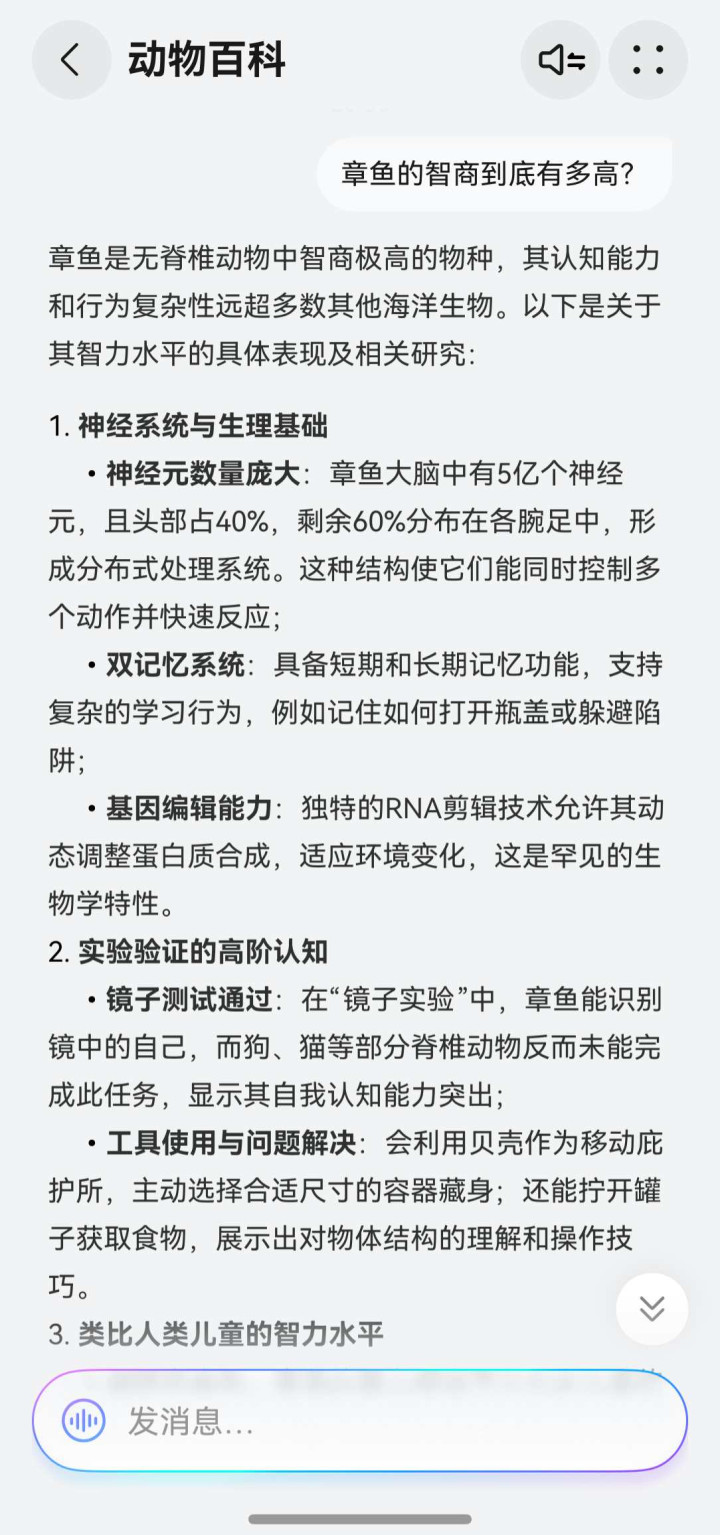 章鱼的智商到底有多高? 小艺里的动物百科Agent给出了答案!